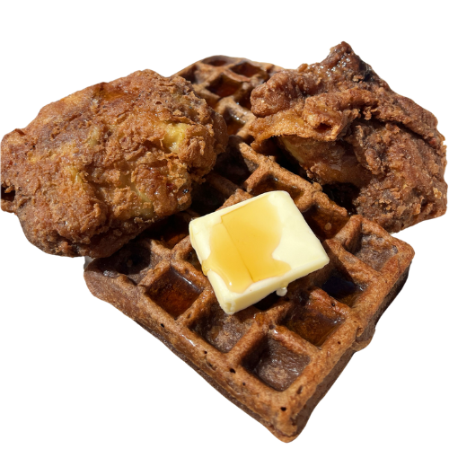 Crispy chicken breaded in our All purpose flour mix, served over waffles made with 100% local flours. A savory-sweet favorite.