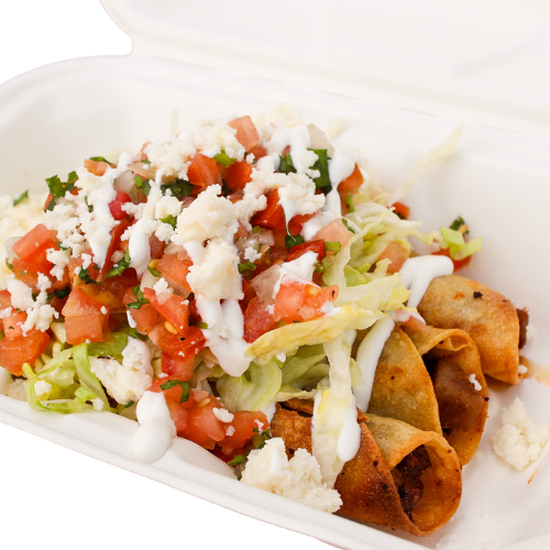 Golden corn tortillas stuffed with taro and beef, topped with lettuce, pico, cheese, sour cream, and our homemade salsa.