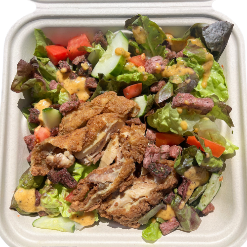 Local greens, breaded chicken with our house flour mix, and topped with our signature Kalo croutons. Comes with your choice of dressing.